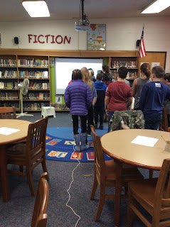 In the "power of words" lesson, we discussed reactions to different online statements and how to handle them. In this photo, students decided what had "crossed the line" and what hadn't, by stepping to one side of the line (the rope going down the middle of the library!). This photo shows the students in agreement-- the statement I had read hadn't crossed the line. However, for many of the statements, I had a handful of students on either side of the line. We talked about how important it is to think before typing-- should I post that? How might the other person feel?